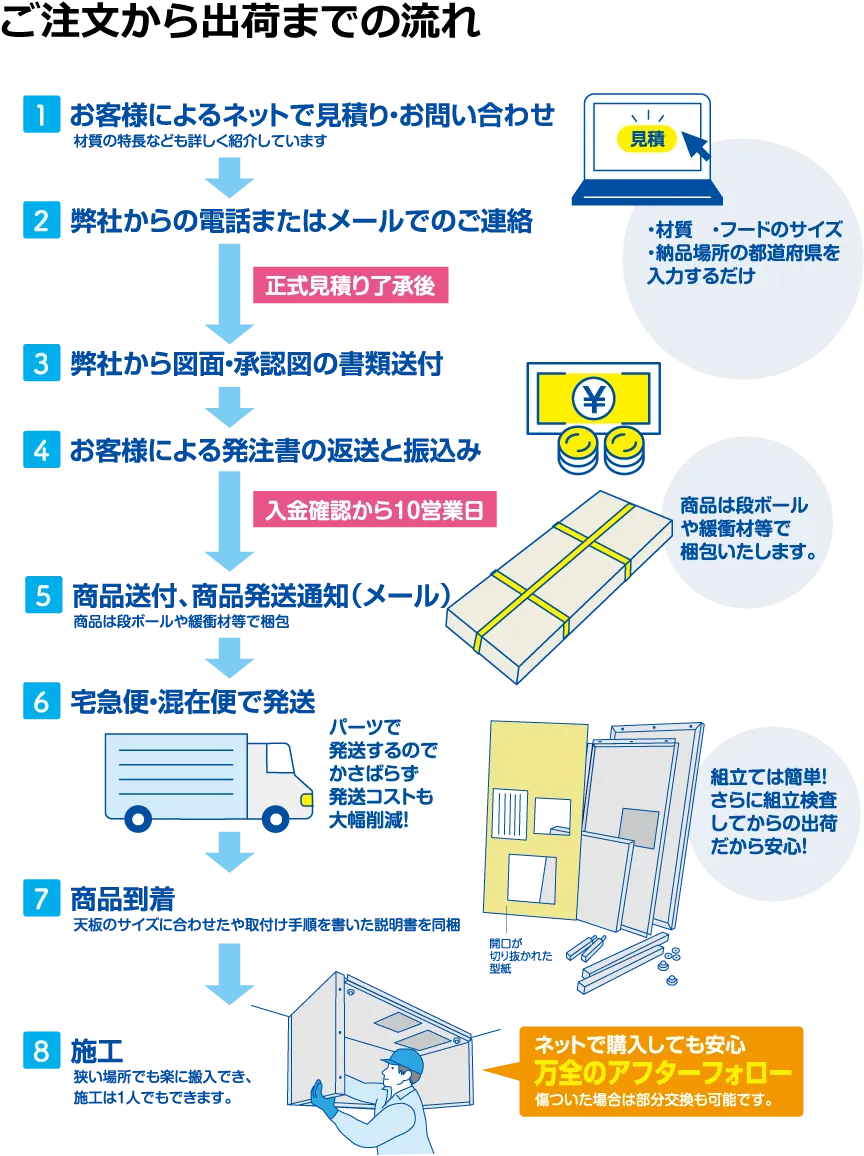 ご指定のサイズで組み立て式の厨房フードを制作します。